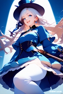 source_anime, score_9, score_8_up, score_7_up, score_6_up, score_5_up, best quality,rein, 1girl, solo, smile, hat, open mouth, blue eyes, dress, low-tied long hair, pantyhose, jewelry, top hat, long sleeves, tiara, white pantyhose, realistic proportions, 1 girl