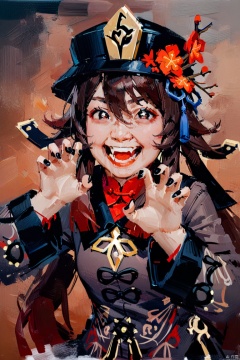 full shot, chibi, grimaces, emoji, frightening, 1girl, solo, long hair, looking at viewer, smile, open mouth, bangs, simple background, brown hair, long sleeves, hat, hair between eyes, twintails, flower, :d, chibi, nail polish, black eyes, black headwear, chinese clothes, black nails, hat ornament, emphasis lines, hat flower, claw pose, hu tao \(genshin impact\),
