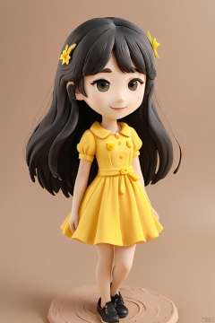 1girl,black hair,smile,cute,air bangs,long hair,delicate facial features,full body,yellow dress,simple background,clay,3D clay,best quality,Ultra HD,Ultra Details,masterpiece,