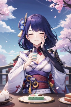 raiden shogun, 1girl, food, sash, japanese clothes, breasts, obi, hand on own face, wagashi, closed eyes, purple hair, solo, hand on own cheek, cleavage, hair ornament, bridal gauntlets, bottle, obiage, kimono, obijime, armor, bangs, mole under eye, tomoe \(symbol\), blush, smile, holding, mitsudomoe \(shape\), dango, sparkle, cherry blossoms, sky, day, outdoors, mole, onigiri, wide sleeves, plate, blurry, eating, long hair, cup, ^_^, long sleeves, petals, blunt bangs, shoulder armor, cloud, vision \(genshin impact\), tree, closed mouth, purple kimono, blue sky, facing viewer, holding bottle, braid, large breasts, raiden shogun
