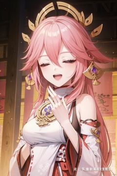 yae miko, 1girl, chopsticks, long hair, pink hair, solo, hair between eyes, detached sleeves, closed eyes, bangs, fox ears, holding chopsticks, animal ears, holding, jewelry, earrings, sidelocks, smile, blurry, vision \(genshin impact\), hair ornament, depth of field, japanese clothes, wide sleeves, ^_^, chinese text, long sleeves, fox girl, subtitled, nontraditional miko, breasts, upper body, :d