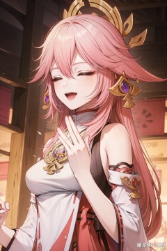 yae miko, 1girl, chopsticks, long hair, pink hair, solo, hair between eyes, detached sleeves, closed eyes, bangs, fox ears, holding chopsticks, animal ears, holding, jewelry, earrings, sidelocks, smile, blurry, vision \(genshin impact\), hair ornament, depth of field, japanese clothes, wide sleeves, ^_^, chinese text, long sleeves, fox girl, subtitled, nontraditional miko, breasts, upper body, :d