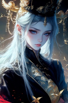 1girl, solo, long hair, looking at viewer, hair ornament, hat, jewelry, upper body, white hair, earrings, grey eyes, makeup, facial mark, chinese clothes, tassel, forehead mark, red lips