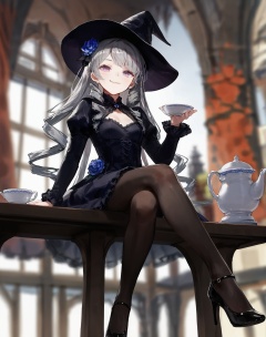 (score_9,score_8_up,score_7_up,),1girl,solo,hat,pantyhose,flower,teacup,dress,crossed legs,cup,witch hat,sitting,long hair,holding,purple eyes,looking at viewer,long sleeves,teapot,black headwear,table,blue flower,black footwear,purple flower,drill hair,grey hair,puffy sleeves,black dress,shoes,juliet sleeves,bangs,breasts,smile,brown pantyhose,hat flower,full body,witch,black pantyhose,high heels,saucer,frills,rose,small breasts,closed mouth,blue rose,hand up,very long hair,from below,depth of field,from below,depth of field,<lora:tpony-style-v1-000100pn3:0.8>,