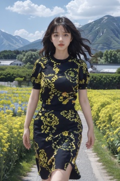 Realistic,masterpiece,best quality,8K,HDR,RAW,1girl,((solo)),(Spring scenery, mountains in the distance, beautiful clouds, rape flower fields),(standing),large breasts,Looking at the audience,<lora:add_detail:0.6>,<lora:GoodHands-beta2:1>,<lora:ENNE 黑底印花连衣裙_v10:1>,china dress,short sleeves,black dress,printed dress,
