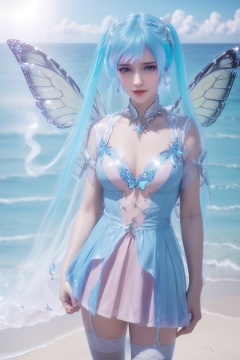 photo_\(medium\),(8k, RAW photo, best_quality),(masterpiece:1.2),(realistic:1.2),(photorealistic:1.3),(ultra-detailed),(extremely_detailed_cg_8k_wallpaper),(crystal_texture_skin:1.3),(shiny:1.2),(shiny_skin:1.4),(extremely_delicate_and_beautiful),Summer,Beach,Sea,sunshine,shenfengTangWuTong,1girl,solo,torogao,dress,blue hair,gradient hair,blue theme,twintails,standing,butterfly,butterfly wings,pleated skirt,white thighhighs,wings,jewelry,hair ornament,lips,realistic,looking at viewer,<lora:shenfengTangWuTong_20240511230122-000006:0.7>,