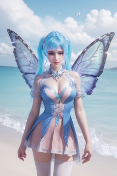 photo_\(medium\),(8k, RAW photo, best_quality),(masterpiece:1.2),(realistic:1.2),(photorealistic:1.3),(ultra-detailed),(extremely_detailed_cg_8k_wallpaper),(crystal_texture_skin:1.3),(shiny:1.2),(shiny_skin:1.4),(extremely_delicate_and_beautiful),Summer,Beach,Sea,sunshine,shenfengTangWuTong,1girl,solo,torogao,dress,blue hair,gradient hair,blue theme,twintails,standing,butterfly,butterfly wings,pleated skirt,white thighhighs,wings,jewelry,hair ornament,lips,realistic,looking at viewer,<lora:shenfengTangWuTong_20240511230122-000005:0.7>,