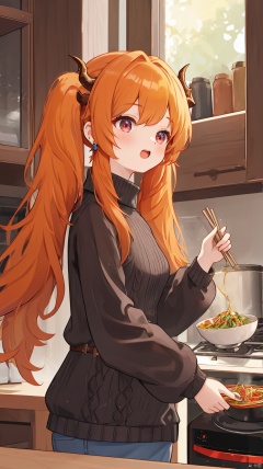 exusiai_dust,2girls, demon horns, ifrit \(arknights\), saria \(arknights\), best quality, detailed, upper body, standing, holding chopsticks, dragon horns, open mouth, orange eyes, long hair, grey hair, blonde hair, silver hair, twintails, bangs, breasts, shirt, ribbed sweater, black sweater, turtleneck sweater, long sleeves, belt, earrings, indoors, id card, food, cooking, mug, :d, frying pan, bowl