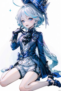 furina, 1girl, solo, gloves, single glove, white background, shorts, blue eyes, smile, long hair, hat, simple background, blue headwear, looking at viewer, sitting, open mouth, multicolored hair, ahoge, white shorts, black gloves, shirt, frilled sleeves, streaked hair, blue hair, long sleeves, hair between eyes, :d, ascot, jacket, top hat, brooch, very long hair, frills, white hair, hand up, bow, bangs, wariza, white shirt, short shorts