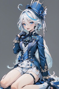 furina, 1girl, solo, gloves, single glove, white background, shorts, blue eyes, smile, long hair, hat, simple background, blue headwear, looking at viewer, sitting, open mouth, multicolored hair, ahoge, white shorts, black gloves, shirt, frilled sleeves, streaked hair, blue hair, long sleeves, hair between eyes, :d, ascot, jacket, top hat, brooch, very long hair, frills, white hair, hand up, bow, bangs, wariza, white shirt, short shorts
