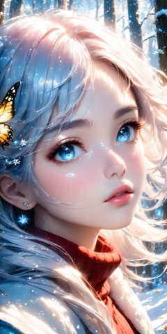 HD, CG, extreme details, fairy style, fisheye lens, exquisite facial features, clear pupils, moist lips, ((4k,masterpiece,best quality)), professional camera, 8k photos, wallpaper Masterpiece, best quality, extremely fine CG unified 8k wallpaper,(extremely detailed CG unity 8k wallpaper),(masterpiece), (best quality), (ultra-detailed), (best illustration),(best shadow), (an extremely delicate and beautiful), classic, dynamic angle, floating, finely detail, Depth of field, classic, (painting), (sketch), (bloom), (shine), glinting stars, a girl,solo,Winter clothing, diamond and glaring eyes, beautiful detailed cold face, very long blue and sliver hair, wavy hair, extremely delicate and beautiful girls, beautiful detailed eyes, glowing eyes,Upper body,(female focus), winter, (forest),snow-covered landscape, (fairyland,flowers, nature), ((super detailed details)), ultra- high resolution, 8k, fisheye lens, beautiful, xihua