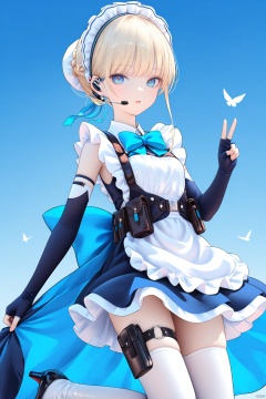 1girl,solo,(masterpiece:1.3),( beautiful:1.2),(high quality:1.2),(finely detailed:1.2),extremely detailed CG unity 8k wallpaper,best quality,a very delicate and beautiful,perfect fingers,(one cute girl at the center:1.2), looking_at_viewer,short sleeves, thighhighs, gloves,dress, bow, thighs, boots, frills, black gloves, elbow gloves, fingerless gloves, bowtie,apron, high heels, maid, maid headdress, thigh strap, blue bow, maid apron, high heel boots, headset, pouch, blue bowtie, holster, harness, thigh holster, chestharness,earpiece, blond_hair,tokiBA