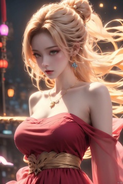 1girl,Bangs, off shoulder, colorful_hair, ((colorful hair)),golden dress, yellow eyes, chest, necklace, pink dress, earrings, floating hair, jewelry, sleeveless, very long hair,Looking at the observer, parted lips, pierced,energy,electricity,magic,tifa,sssr,blonde hair,jujingyi, wangyushan, dofas, forehead mark, (\yan yu\), qingyi