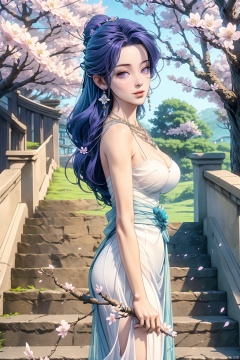 1girl, solo, long hair, breasts, looking at viewer, dress, cleavage, jewelry, medium breasts, standing, purple eyes, purple hair, flower, earrings, outdoors, necklace, white dress, blurry, from side, tree, see-through, facial mark, cherry blossoms, stairs, forehead mark, skirt hold, branch, qingyi