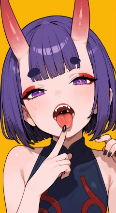 score_9,score_8_up,score_7_up,score_6_up,1girl,solo,tongue,shuten douji \(fate\),purple eyes,tongue out,bangs,looking at viewer,makeup,black nails,short hair,purple hair,fang,portrait,nail polish,bob cut,eyeliner,close-up,oni horns,yellow background,eyeshadow,eyelashes,short eyebrows,fingernails,blunt bangs,open mouth,finger to mouth,thick eyebrows,<lora:tpony-style-v2:0.8>,