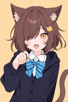 1girl,solo, animal ears, bow, teeth, jacket, tail, open mouth, brown hair, orange background, bowtie, orange nails, simple background, cat ears, orange eyes, blue bow, animal ear fluff, cat tail, looking at viewer, upper body, shirt, school uniform, hood, striped bow, striped, white shirt, black jacket, blue bowtie, fingernails, long sleeves, cat girl, bangs, fangs, collared shirt, striped bowtie, short hair, tongue, hoodie, sharp teeth, facial mark, claw pose, hooded jacket, blue hoodie, yellow background, hair ornament, paw ornament, tail raised, dress shirt, hairpin, slit pupils, hair over one eye, arm behind back, striped clothes, whisker markings, hand up