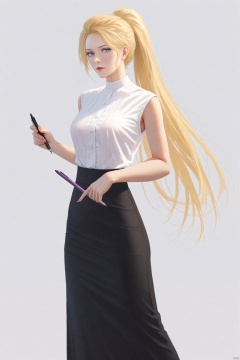 masterpiece,best quality,high quality,(colorful),Colored lead Style, 1girl, solo, blonde hair, long hair, skirt, blue eyes, white background, looking at viewer, black skirt, simple background, sleeveless, shirt, holding, white shirt, pen, long skirt, red lips, standing, ponytail, closed mouth, holding pen