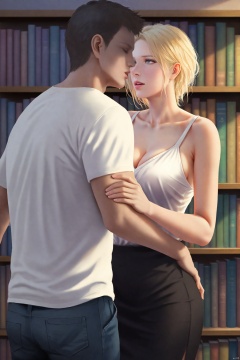 masterpiece,best quality,high quality,(colorful),Colored lead Style, 1girl, 1boy, blonde hair, hetero, bookshelf, shirt, short hair, white shirt, skirt, indoors, breasts, looking at another, sleeveless, cleavage, imminent kiss, book, blurry, parted lips, black skirt, pants, couple, lips, faceless male, eye contact