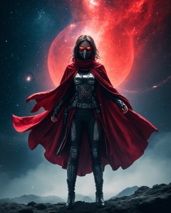 DARK throwing a Stone Pose,fight stance,Leg Up,Low Angle View,. a woman with rotten Guy fawkes mask and a outworn detailed old high collar and vibrant translucent DARK-red cyberpunk Samurai jacket,Large linen cape,surrounded by a detailed monochrome spacescape with translucent vibrant Blood red Highlights,hyper-detailed,sharp,high resolution,high quality,32K,Ultra realistic,HD,super detailed,line art,abstract style,. ethereal,atmospheric haze,Film grain,cinematic film still,shallow depth of field,highly detailed,high budget,cinemascope,moody,epic,OverallDetail,gorgeous,2000s vintage RAW photo,photorealistic,candid camera,color graded cinematic,eye catchlights,atmospheric lighting,skin pores,imperfections,natural,shallow dof,In the depths of this nocturnal tableau lies the promise of exploration and discovery,where the spirit of the astronaut converges with the boundless possibilities of the cosmos. Though Earthbound for now,her spirit remains untethered,reaching out towards the distant stars with an unyielding resolve to explore,to discover,and to soar beyond the limits of imagination.,