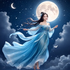 1girl,chinese hanfu,bare_shoulders,breasts,flying to the moon,full body,long hair,princess dress,starry sky,off-shoulder_dress,full moon,sea,blue theme,gradient,silhouette,rabbit,Chinese text,cloud,flower,