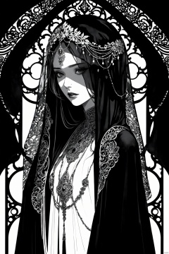the essence of a woman's face,partially obscured by a black veil. Her eyes,the windows to her soul,are the focal point of this image. They are large and expressive,framed by thick,dark eyelashes that add depth and intensity to her gaze. The veil,draped over her head and covering her mouth,adds an air of mystery and intrigue. A decorative headpiece adorns her forehead,its intricate design adding a touch of elegance and cultural significance. The background is a stark black,providing a stark contrast that accentuates the details of her face and the veil.The woman's position relative to the background suggests she is standing in front of it. The photograph beautifully encapsulates a moment of quiet contemplation and cultural richness.,
