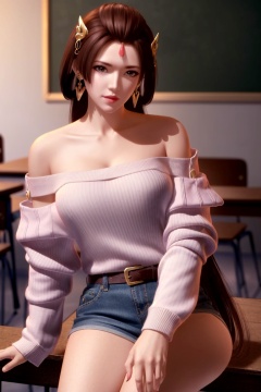 ((HRD, HUD, 8K)),((masterpiece, best quality)), highly detailed,1girl, solo, forehead mark, brown hair, hair ornament, hair rings, long hair, brown eyes, lips, jewelry, earrings, (off-shoulder sweater:1.2), denim shorts, black pantyhose, blurry background, classroom, chalkboard, sitting, cowboy shot, looking at viewer, <lora:20240513-1715564123441:0.7>