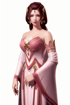 ((HRD, HUD, 8K)),((masterpiece, best quality)), highly detailed,1girl, solo, forehead mark, brown hair, hair ornament, hair rings, long hair, brown eyes, lips, jewelry, earrings, dress, pink dress, bare shoulders, detached sleeves, simple background, white background, cowboy shot, standing, looking at viewer,  <lora:20240513-1715564123441:0.72>