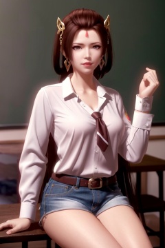 ((HRD, HUD, 8K)),((masterpiece, best quality)), highly detailed,1girl, solo, forehead mark, brown hair, hair ornament, hair rings, long hair, brown eyes, lips, jewelry, earrings, (white shirt:1.2), necktie, denim shorts,blurry background, classroom, chalkboard, sitting, cowboy shot, looking at viewer, <lora:20240513-1715564123441:0.7>