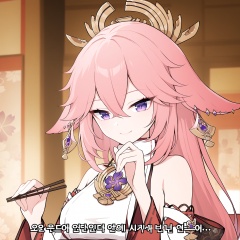 yae miko, 1girl, solo, chopsticks, purple eyes, pink hair, long hair, hair between eyes, animal ears, fox ears, holding chopsticks, holding, blurry, jewelry, earrings, bangs, smile, depth of field, detached sleeves, bare shoulders, korean text, japanese clothes, blurry background, hair ornament, upper body, subtitled, closed mouth