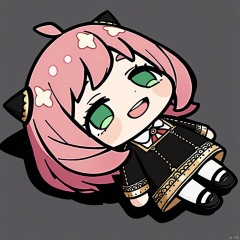 lying-on-back, chibi,(masterpiece),(best quality),Anya Forger, 1girl, anya \(spy x family\), solo, female child, pink hair, green eyes, school uniform, eden academy school uniform, smile, dress, sitting, looking at viewer, open mouth, black footwear, black dress, child, shirt, :d, long sleeves, full body, shoes, medium hair, bangs, ahoge, white pantyhose, collared shirt