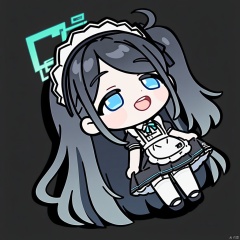 1girl, solo, aris \(blue archive\), aris \(maid\) \(blue archive\), halo, long hair, black hair, thighhighs, white thighhighs, apron, blue eyes, official alternate costume, maid headdress, maid, very long hair, full body, simple background, white background, short sleeves, open mouth, dress, looking at viewer, maid apron, white apron, black footwear, borrowed clothes, shoes, black dress, frilled apron, frills, blush, upper teeth only, ponytail, smile, puffy sleeves, standing, side ponytail, teeth, puffy short sleeves, absurdly long hair, garter straps, skirt hold, bow, sidelocks,