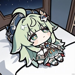lying-on-back, chibi,(masterpiece),(best quality),(best quality), huohuo \(honkai_star_rail\), hat, 1girl, perfect face, bright pupils, (finely detailed beautiful eyes), green eyes, wide_hips, green hair, long hair, bangs, ahoge, hair ornament, (white sweater, long sleeves, sleeves past wrists), pleated skirt, white legwear, fox tail, night, indoors, full body, shoulder level shot, wide shot, (kneeling, on bed), v arms, (delicate fingers, five fingers on hand),
