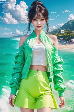 sports shoes, socks, white and green dresses, open jacket, hair bun, fluffy long sleeves, (short top: 1.3), pants, (whole body: 1.1), gradient