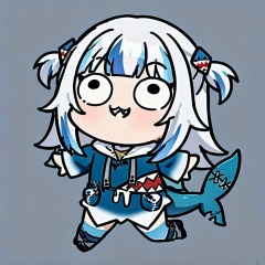 style-parody,chibi,full_body,(masterpiece),(best quality),1girl, gawr gura, virtual youtuber, tail, fish tail, shark tail, solo, blue eyes, multicolored hair, grey hair, full body, blue hair, streaked hair, bangs, hair ornament, shark hair ornament, two side up, white background, hood, blunt bangs, shark girl, hoodie, simple background, blue hoodie