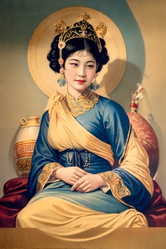 poster,female, fantasy illustration, long flowing hair, intricate headdress, mythical accessories, vibrant colors, semi-transparent clothing, ornate jewelry, seated pose, ethereal atmosphere, golden accents, suggestion of movement, multiple limbs hinting at deity, serene expression, mystical aura, Asian art influence, soft lighting, dark background, use of gold leaf effect, digital painting.