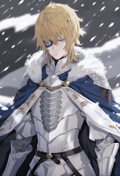 masterpiece, best quality,1boy, male focus, dimitri alexandre blaiddyd, eyepatch, solo, blonde hair, blue eyes, cape, fur trim, snowing, blue cape, armor, closed mouth, belt, hair between eyes, snow, frown, outdoors, cosplay, pauldrons, letterboxed, long sleeves, chainmail, cowboy shot, day, breastplate, plate armor, lucena \(lodoss\) \(cosplay\), fur-trimmed cape, short hair, looking at viewer, shoulder armor, medium hair <lora:kotrou020XLlokr8f-000180:0.95>