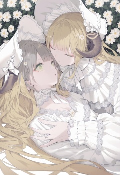 masterpiece, best quality, flower, multiple girls, 2girls, dress, closed eyes, blonde hair, white dress, white flower, horns, long hair, green eyes, white headwear, white background, bangs, grey hair, long sleeves, animal ears, yuri, simple background, lace, bonnet, parted lips, cage, hat, lying, looking at another, cat ears, on back  <lora:kotrou020XLlokr8f-000180:0.95>