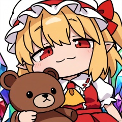 close-up, chibi, smug, (masterpiece),(best quality),1girl, flandre scarlet, touhou, hat, mob cap, solo, blonde hair, stuffed toy, red vest, wings, stuffed animal, teddy bear, red eyes, crystal, vest, white headwear, outdoor, short sleeves, one side up, holding, puffy sleeves, skirt, shirt, pointy ears, red skirt, looking at viewer, puffy short sleeves, ascot, yellow ascot, wrist cuffs, white shirt, holding stuffed toy, bow, frills, red bow, collared shirt, ribbon, frilled shirt collar, red ribbon, medium hair masterpiece, best quality, very aesthetic, absurdres
