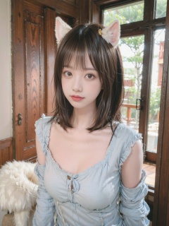 1girl,solo,long hair,brown hair,anger vein,animal ears,looking at viewer,bangs,hair ornament,realistic,blunt bangs,cosplay,upper body,indoors,closed mouth,long sleeves,lips,blurry background,brown eyes,