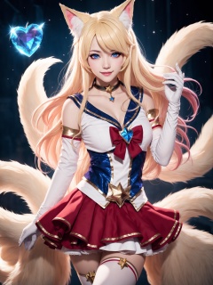 Best quality,4K,HDR,RAW photo,ultrafine detailed,Star Guardian Ahri,1girl, tail, ahri (league of legends), fox tail, animal ears, heart, thighhighs, fox ears, long hair, skirt, A red short skirt,multiple tails, blonde hair, solo, looking at viewer, smile, choker, white,gloves,sailor senshi uniform,detached sleeves, fox girl, blue eyes, idol, magical girl, purple eyes,<lora:Ahri_20240510232413:0.8>
