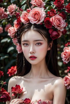 1girl,flower,solo,(Photography blockbuster:1.6),masterpiece,8k,rose,looking at viewer,makeup,red lips,long hair,red flower,petals,red rose,brown eyes,pink flower,lips,collarbone,lipstick, <lora:rose fashion:0.6>,