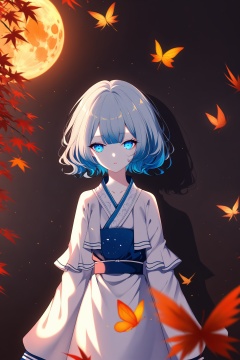 (masterpiece),(best quality),illustration,ultra detailed,hdr,Depth of field,(colorful),sheya,focus,masterpiece,solo,gradient_background,autumn,best quality,lantern,Through the mottled light and shadow of leaves,late at night,wind,flying butterfly,flying petal,maple,Falling Maple Leaves,Orange Moon,1 girl,Beautiful and meticulous eyes,small breast,beautiful detailed,hanfu-anime-style,Grey gradient hair Blue highlights,hairpin,hime_cut,sleeves past wrists,sleeves past fingers,sigh,strong rim light,anime screenshot,Bust,solo focus,extremely detailed wallpaper,Personage as the main perspective,intense shadows,cinematic lighting,depth of field,painting,