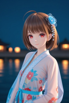 (masterpiece),(best quality),illustration,ultra detailed,hdr,Depth of field,(colorful),mmd,night,1girl,solo,red eyes,looking at viewer,hair ornament,short hair,upper body,brown hair,blurry,ahoge,bangs,see-through,depth of field,hanfu,smile,floral print,closed mouth,