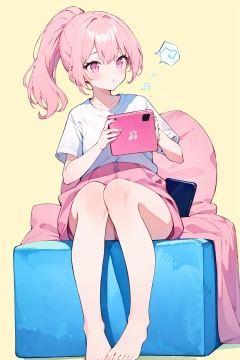 masterpiece,bright,high quality,1girl,sportswear,yellow background,no shirt,head lift,air bubble,Ultra-Wide Angle,solo,light pink hair,pony_tail,hair_censor,bare_feet,long_legs,((holding pink smart phone)),watercolor_(medium),watercolor,cozy anime,