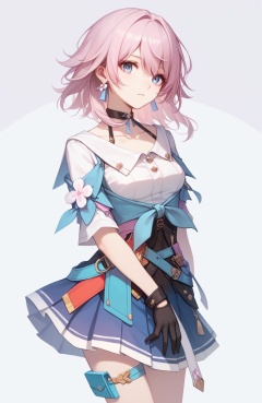 <lora:naipixa31-000019:0.0>,<lora:三月七pony:1>,march7th,a girl named march7th,1girl,white shirt,tied jacket,black choker,single earring,pleated skirt,flower ornament,black corset,collarbone,black gloves,thigh strap,, (score_9,score_8_up,score_7_up),(masterpiece,best quality,high quality:1.2),absurdres,