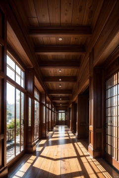 Ancient Chinese style corridor with spacious design, circular wooden columns, red wall decorations, hollow carved windows, rough stone flooring, Chinese style, vintage craftsmanship, last century architecture, ultra detailed textures, optimal proportions, 8K HD, high-resolution,  AI Chinese Style