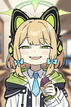 anya-face,full_body,(masterpiece),(best quality),1girl, (masterpiece),(best quality),1girl,midori \(blue archive\),blue archive,aiamu iamu,holding food,holding,hooded jacket,food,sidelocks,:d,collared shirt,blurry,long sleeves,puffy sleeves,headphones,blue bow,hand up,necktie,halo,looking at viewer,jacket,sleeves past wrists,blush,nail polish,blue necktie,animal ear headphones,blurry background,blonde hair,shirt,green eyes,hood down,open clothes,depth of field,hood,smile,white jacket,fake animal ears,bow,puffy long sleeves,open jacket,solo,dress shirt,animal ears,white shirt,blue nails,hair bow,long hair,drawstring,sweet potato,