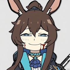 anya-face,smile,(masterpiece),(best quality),full_body,(masterpiece),(best quality),1girl, animal ears, amiya (arknights), solo, blue eyes, rabbit ears, long hair, holding, looking at viewer, blood, weapon, blue ascot, upper body, holding weapon, brown hair, ascot, hair between eyes, sword, holding sword, jacket, blood on face, closed mouth, open clothes, sidelocks, open jacket, jewelry, shirt, neck ring, white shirt, black jacket, ponytail, glowing,