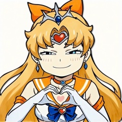 anya-face,(masterpiece),(best quality),1girl,sailor venus,masterpiece,best quality,very aesthetic,absurdres,aavenus,long hair,blonde hair,hair bow,tiara,blue eyes,earrings,orange choker,collarbone,orange sailor collar,blue bowtie,white shirt,white leotard,elbow gloves,white gloves,pleated skirt,orange skirt,heart hands,traditional media,