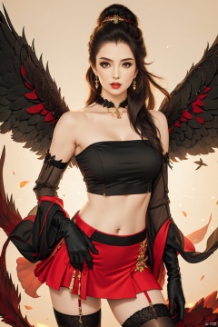 1girl, solo, long hair, looking at viewer, skirt, black hair, hair ornament, thighhighs, gloves, navel, bare shoulders, jewelry, cowboy shot, earrings, detached sleeves, wings, midriff, crop top, red skirt